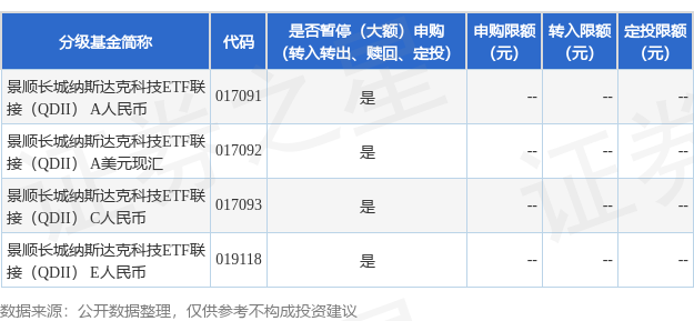 本站消息,8月29日景顺长城基金管理有限公司发布《景顺长城纳斯达克科技市值加权交易型开放式指数证券投资基金发起式联接基金(QDII)境外主要市场节假日暂停申购(含日常申购和定期定额投资)、赎回和转换业务的公告》。公告中提示,为2025年9月1日纳斯达克市场无交易,自2025年9月1日起景顺长城纳斯达克科技市值加权交易型开放式指数证券投资基金发起式联接基金(QDII)境外主要市场节假日暂停申购(含日常申购和定期定额投资)、赎回和转换业务,下属分级基金调整明细如下: